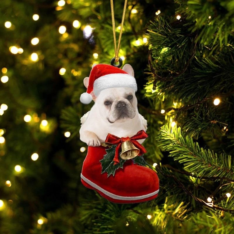 French Bulldog White In Santa Boot Christmas Hanging Ornament SB180