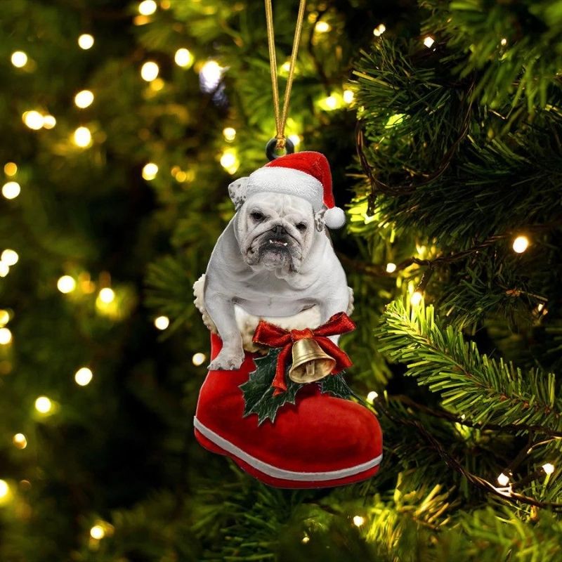 English Bulldog White In Santa Boot Christmas Hanging Ornament SB183