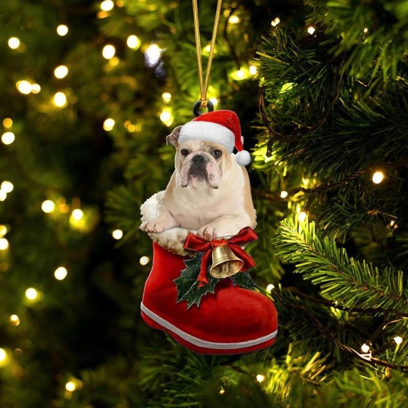 English Bulldog Fawn In Santa Boot Christmas Hanging Ornament SB184
