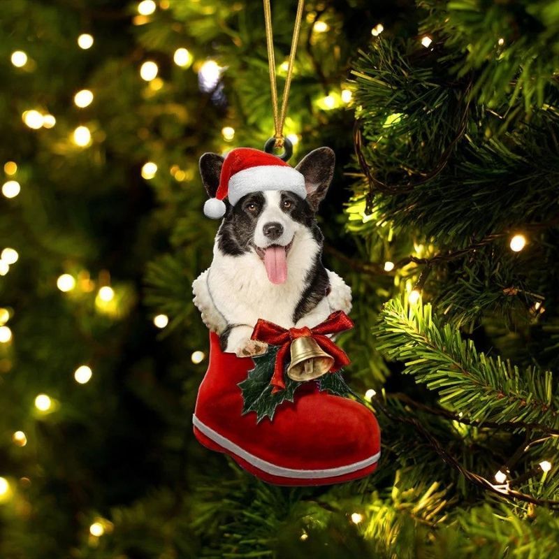 Pembroke Welsh Corgi Sable & White In Santa Boot Christmas Hanging Ornament SB176
