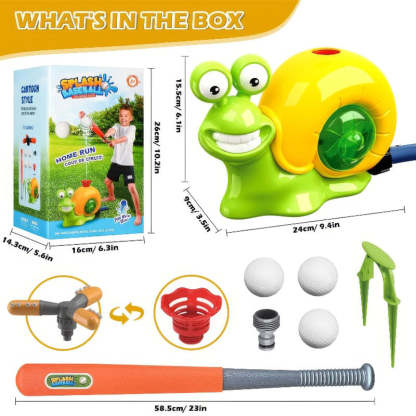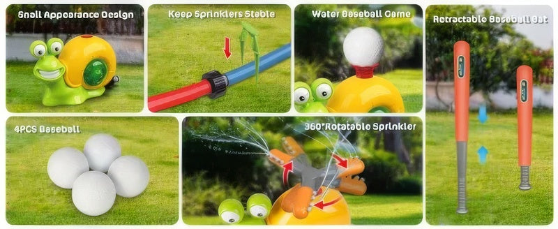 🌞IDEAL SUMMER WATER PLAY GIFT – The sprinkler baseball toy is an ideal summer gift for boys and girls ages 3 4 5 6 7 8 9 10 11 12. The water sprinkler toy set includes: 1 * snail sprinkler, 1 * water column nozzle, 1 * 360° rotating nozzle, 1 * retractable baseball bat, 4 * baseballs, 1 * ground stake. The snail’s appearance design is interesting and attractive, which can immediately attract children’s attention. Get ready for a summer of water play and baseball fun!