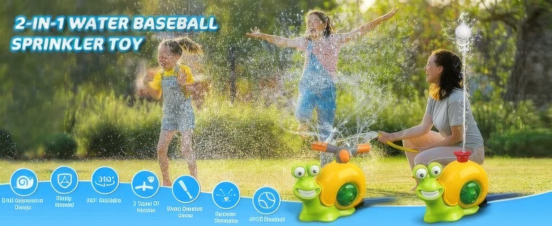 🐌2 IN 1 SPRINKLER FOR KIDS – This sprinkler toy set includes two sprinkler heads. One is a water column nozzle that can be combined with the included baseball to train baseball batting skills; the other is a 360° rotating nozzle with a wide spray area that allows children to play happily in the water during the hot summer. The combination of the two games is refreshing and brings endless fun to this summer.