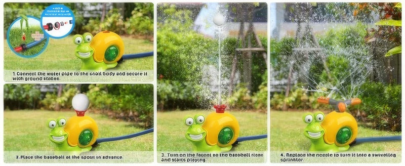 🥎EASY TO INSTALL AND USE – There are two ways to connect this snail sprinkler toy: one is to connect the nut directly to the threaded garden hose (nut inner diameter 0.59in/1.5cm); the other is to connect the included connector to the nut, then connect the unthreaded hose (connector outer diameter 1.06in/2.7cm). The faster the water flow, the higher the baseball height of the spray, and the wider the range of the sprinkler spray, and vice versa.